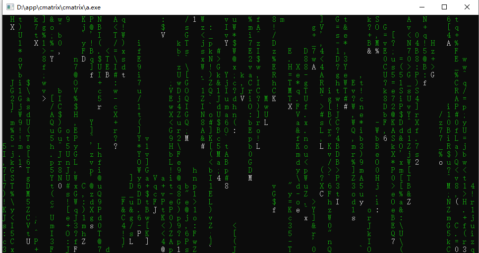 有一个patch补丁文件,下载下载用patch 命令更新cmatix.c这个文件,再编译,提示缺少curses.h头文件,搜索了上下文代码直接扔mingw目录下的include文件夹了, 用gcc -DVERSION="2.0" -I/path/to/pdcurses/include/dir/ cmatrix.c /path/to/pdcurses.a 命令编译了下,直接出来了一个a.exe文件,gcc默认是这个文件,看来问题不大了。